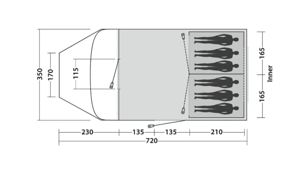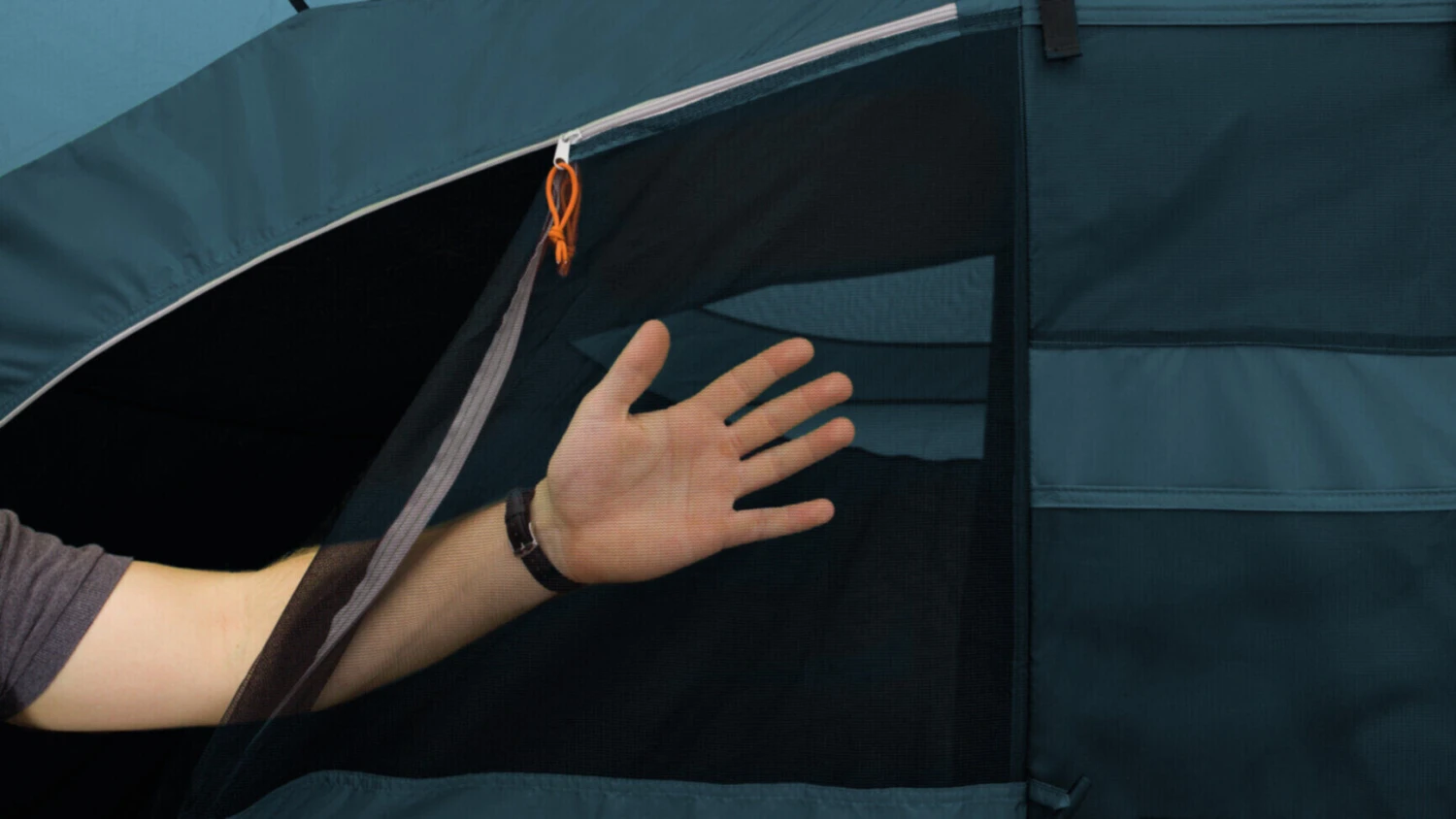 The tent is a 3 zone living style, with a fully sheltered area to the front which is ideal as a wet zone to keep damp clothing or bikes stored, you can also use this space as a spot to sit during the warmer months with the doors opened up, a nice sized living area in the centre with a curtained window gives privacy when you need it from external campers, a pleasurable space to dine together or just spend some quality time socialising it also features an insect-proof mesh door ideal for ventilation especially during the warmer months, and finally the sleep-tight bedrooms give you a darkened area to avoid the early wake up calls from the morning light, giving you that much needed rest before your adventures begin the following day. You will find Organiser pockets in the living area and in the inner tent areas great for storing thefamilies accessories that they want to keep within easy reach