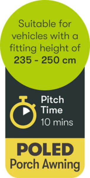 The Quest Falcon 390 poled porch caravan awning is designed to be lightweight, budget and user friendly, due to the lightweight fabric a small pack size is achieved, simply remove the poles and roll down your awning with no fuss – The small pack size is also helped by using the minimal quick-fit pole system which is a design that uses as few poles as possible to make pitching simple and quick, pitching this awning can easily be done by 1 person in around 15 minutes, pitch it without the poles in and remove some panels to make it even lighter which helps when gliding the awning on to the van rail. For a perfect fit this awning requires the height of the fitting rail on the van to be between 235 – 250cm